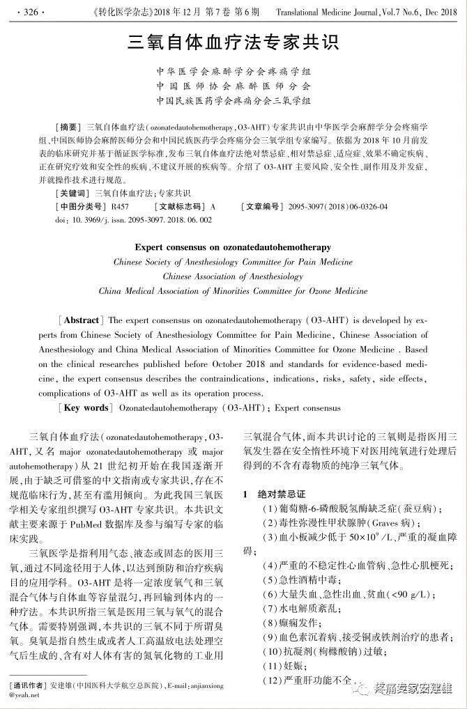 中國(guó)第一部三氧自體血共識(shí)發(fā)布——三氧自體血療法專家共識(shí)(新)时间:2019-02-26 作者:王先明13853105360【转载】 三氧自體血療法專家共識(shí) 中華醫(yī)學(xué)會(huì)麻醉學(xué)分會(huì)疼痛學(xué)組 中國(guó)醫(yī)師協(xié)會(huì)麻醉醫(yī)師分會(huì) 中國(guó)民族醫(yī)藥學(xué)會(huì)疼痛分會(huì)三氧學(xué)組 三氧自體血療法(ozonatedautohemotherapy,O3-AHT,又名major ozonated autohemotherapy或major autohemotherapy) ,是將一定濃度氧氣和三氧混合氣體與自體血等容量混勻,再回輸?shù)襟w內(nèi)的一種療法。 此療法本世紀(jì)初開(kāi)始在我國(guó)逐漸開(kāi)展,但一直缺乏可借鑒的中文指南或?qū)<夜沧R(shí)。為此我國(guó)三氧醫(yī)學(xué)相關(guān)專家組織撰寫三氧自體血療法專家共識(shí)。供大家參考。 經(jīng)過(guò)多次修訂,本共識(shí)已發(fā)表于2018年12月第6期中文核心期刊《轉(zhuǎn)化醫(yī)學(xué)雜志》上。 1. 葡萄糖-6-磷酸脫氫酶缺乏癥(蠶豆�。� 2. 毒性彌漫性甲狀腺腫(Graves病) 3. 血小板減少低于50X109/L、嚴(yán)重的凝血障礙 4. 嚴(yán)重的不穩(wěn)定性心血管病、急性心肌梗死 5. 急性酒精中毒 6. 大量失血、急性出血、貧血(<90g/L) 7、水電解質(zhì)紊亂 8. 癲癇發(fā)作 9. 血色素沉著病、接受銅或鐵劑治療的患者 10、抗凝劑(枸櫞酸鈉)過(guò)敏 11、妊娠 12、嚴(yán)重肝功能不全 1.女性月經(jīng)期。 2.未成年人不建議做O3-AHT,建議用三氧直腸灌注替代。 3.年齡上限無(wú)嚴(yán)格規(guī)定,80歲以上老年人可選用三氧直腸灌注替代。 1.治療期間不建議口服維生素或抗氧化劑,但治療前后可以服用。 2.血管緊張素酶抑制劑:本療法可能增加血管緊張素酶抑制劑降壓作用而導(dǎo)致病人血壓過(guò)低。 3.抗凝藥物:不推薦使用抗凝藥物期間進(jìn)行O3-AHT。 根據(jù)循證醫(yī)學(xué)證據(jù)及專家臨床經(jīng)驗(yàn),本共識(shí)將O3-AHT治療疾病按適應(yīng)證、效果不確定疾病、正在研究療效及安全性的疾病和不建議開(kāi)展的疾病等進(jìn)行分類。 根據(jù)循證醫(yī)學(xué)(EBM),參考美國(guó)預(yù)防服務(wù)工作組及牛津循證醫(yī)學(xué)中心疾病證據(jù)等級(jí)制定方法,將O3-AHT治療的疾病可以分為四類【1、2】: A級(jí)證據(jù):有良好的科學(xué)證據(jù)證實(shí)O3-AHT的臨床益處遠(yuǎn)超 過(guò)潛在的風(fēng)險(xiǎn)。基于隨機(jī)對(duì)照試驗(yàn)的系統(tǒng)回顧、同質(zhì)性隊(duì)列研究的系統(tǒng)評(píng)價(jià)或同種病例對(duì)照研究的系統(tǒng)評(píng)價(jià)。 B級(jí)證據(jù):公平的科學(xué)證據(jù)表明O3-AHT的臨床益處大于潛在的風(fēng)險(xiǎn)�;趥(gè)體隨機(jī)置信區(qū)間小、隊(duì)列研究或病例對(duì)照研究。PUBMED數(shù)據(jù)庫(kù)均可查到相關(guān)文獻(xiàn)。 C級(jí)證據(jù):有公平的科學(xué)證據(jù)表明O3-AHT能夠提供的臨床益處,但利益風(fēng)險(xiǎn)不能確定�;跊](méi)有明確的批判性評(píng)價(jià)的專家意見(jiàn)、病例報(bào)告,或基于生理學(xué)、實(shí)驗(yàn)室研究,或“基本原則”,或描述性流行病學(xué)。PUBMED數(shù)據(jù)庫(kù)均可查到相關(guān)文獻(xiàn)。 D級(jí)證據(jù):主要根據(jù)O3-AHT編寫組專家臨床實(shí),PUBMED數(shù)據(jù)庫(kù)暫無(wú)相關(guān)文獻(xiàn)支持。 (一)適應(yīng)證 A級(jí)證據(jù):無(wú) B級(jí)證據(jù): 1.慢性肝炎【3-4】 2.下肢動(dòng)脈缺血【5-8】 3.突發(fā)性耳聾【9-10】 4.年齡相關(guān)性黃斑變性(萎縮性)【11】 C級(jí)證據(jù): 1.哮喘【12】 2.多發(fā)性硬化【13-14】 3.頭痛【15】 4.痛風(fēng)【16-17】 5.腦梗死【18-19】 6.骶髂關(guān)節(jié)炎【20】 7.帶狀皰疹后神經(jīng)痛【21】 8.癌癥輔助治療[22-23] D級(jí)證據(jù): 1.慢性缺血性心臟病 2.失眠 3.類風(fēng)濕 (二)效果不確定疾病 1.呼吸衰竭:個(gè)案報(bào)道O3-AHT對(duì)改善呼吸衰竭癥狀有效果,需要更多臨床研究證據(jù)支持。 2.腎功能衰竭:有文獻(xiàn)報(bào)道O3-AHT可以增加腎小球過(guò)濾【4】,需要更多臨床研究證據(jù)支持。 3.銀屑�。号R床實(shí)踐O3-AHT對(duì)部分銀屑病有效,但也有少部分病人病情反而加重。 4.高脂血癥:O3-AHT對(duì)部分高血脂病人療效顯著。 (三)正在研究療效和安全性的疾病 1.系統(tǒng)性紅斑狼瘡、干燥綜合征、皮肌炎、硬皮病、強(qiáng)直性脊柱炎等免疫性疾病,從機(jī)制上推斷O3-AHT有效,臨床實(shí)踐也發(fā)現(xiàn)部分病人有效,但需要更多臨床經(jīng)驗(yàn)和循證醫(yī)學(xué)證據(jù)。 2.帕金森病、亨廷頓氏病、克雅氏病、小腦萎縮等神經(jīng)退行性疾病:已證實(shí)O3-AHT對(duì)多發(fā)性硬化病有效,對(duì)其他神經(jīng)退行性病變的療效不明確。 3.呼吸系統(tǒng)(呼吸系統(tǒng)腫瘤除外):目前僅有證據(jù)O3-AHT對(duì)哮喘有效,其他呼吸系統(tǒng)疾病的療效有待研究。 4.泌尿、消化、生殖系統(tǒng)疾�。荷袩o(wú)O3-AHT對(duì)這三個(gè)系統(tǒng)常見(jiàn)病療效的證據(jù)。 (四)不建議開(kāi)展疾病 1.血液系統(tǒng)疾病。 2.甲狀腺功能減退。 3.肺栓塞。 1、抗凝劑:抗凝劑偏少會(huì)引起血栓,而過(guò)量會(huì)導(dǎo)致凝血功能障礙。 2、氣體栓塞:操作不當(dāng)可能造成氣體進(jìn)入血管,形成氣體栓塞。 3、對(duì)高齡及心功
